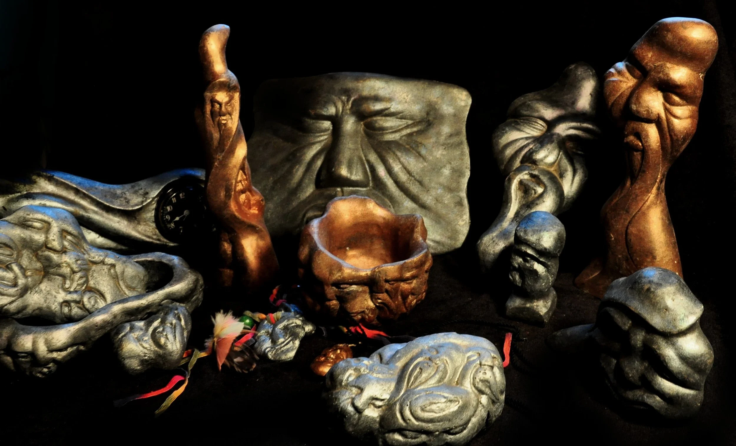Each piece in this collection carries part of my history. I mix wood chips and sawdust from past carvings into the material, giving new life to what came before. The base form is molded, but every surface is re-carved by hand so the paint can take hold and the details come alive.Nothing here is identical — every face is shaped, refined, and painted by hand until it finds its own character.
